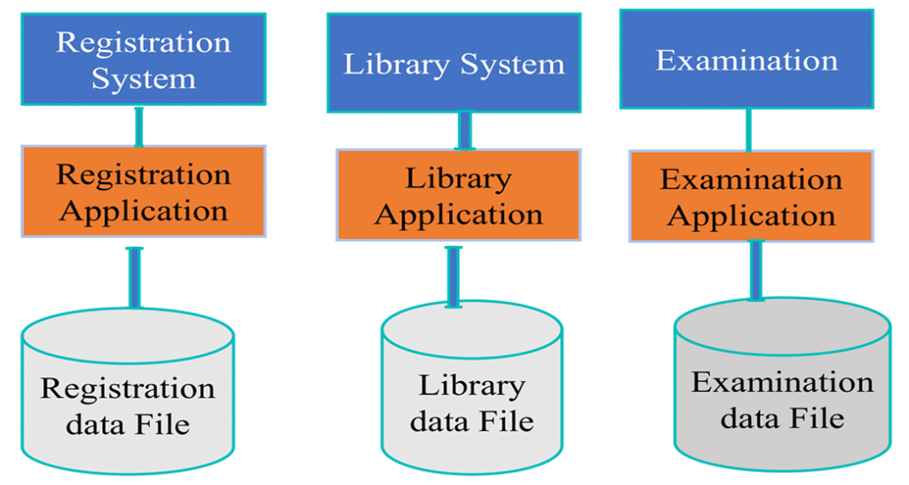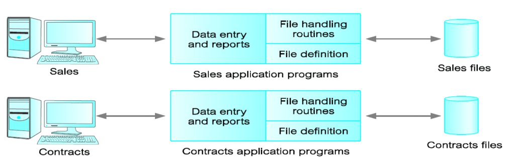 Before modern databases, organizations used file-based systems to store data. In this approach: